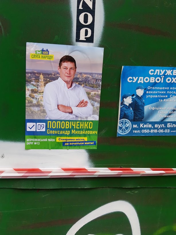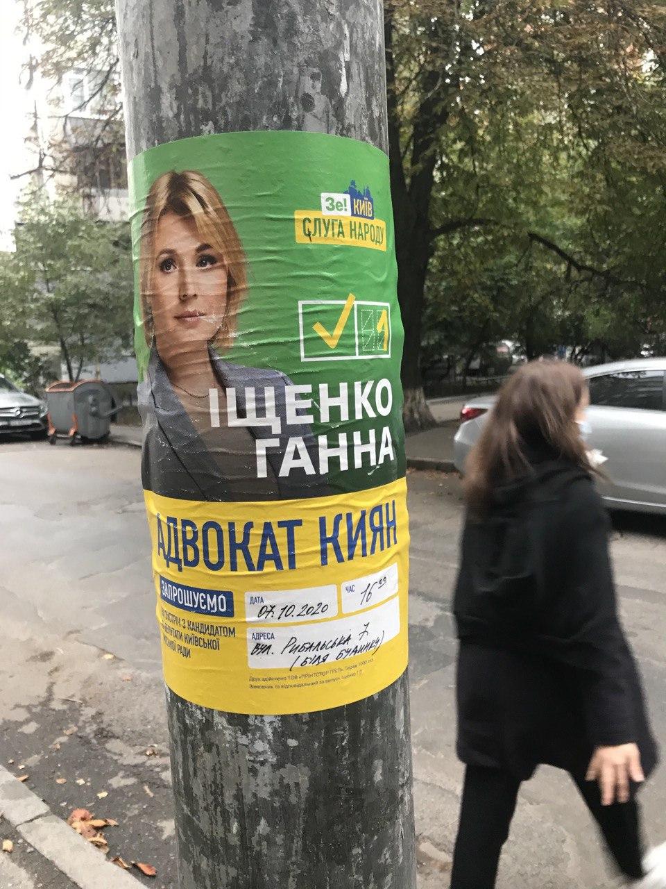 На території Печерського району міста Києва було зафіксовано 3 агітаційні матеріали, розміщені з порушенням “Правил благоустрою міста Києва”. Так, на вулиці Рибальська, 11, листівку кандидатки Ганни Іщенко (“Слуга народу”) про дату та час зустрічі з виборцями розмістили на електроопорі.