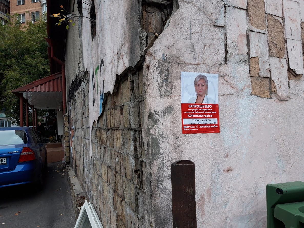 У Шевченківському районі міста спостерігачка ОПОРИ зафіксувала 3 випадки розміщення агітації всупереч правилам благоустрою. На вулиці Глібова на стінах житлового будинку розмістили листівку з логотипом партії “УДАР” та зображенням кандидатки Корінної Надії. Текст на листівці інформував громадян про дату та час зустрічі з кандидаткою: “Запрошуємо на зустріч громадян з кандидатом в депутати Київської міської ради Корінною Надією”.