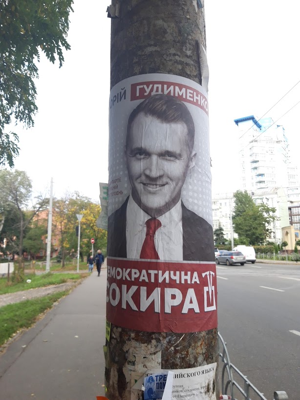 На електроопорі на вулиці Чорновола висить плакат із зображенням Юрія Гудименка, який балотується за списками “Демократичної Сокири” у Шевченківському районі.