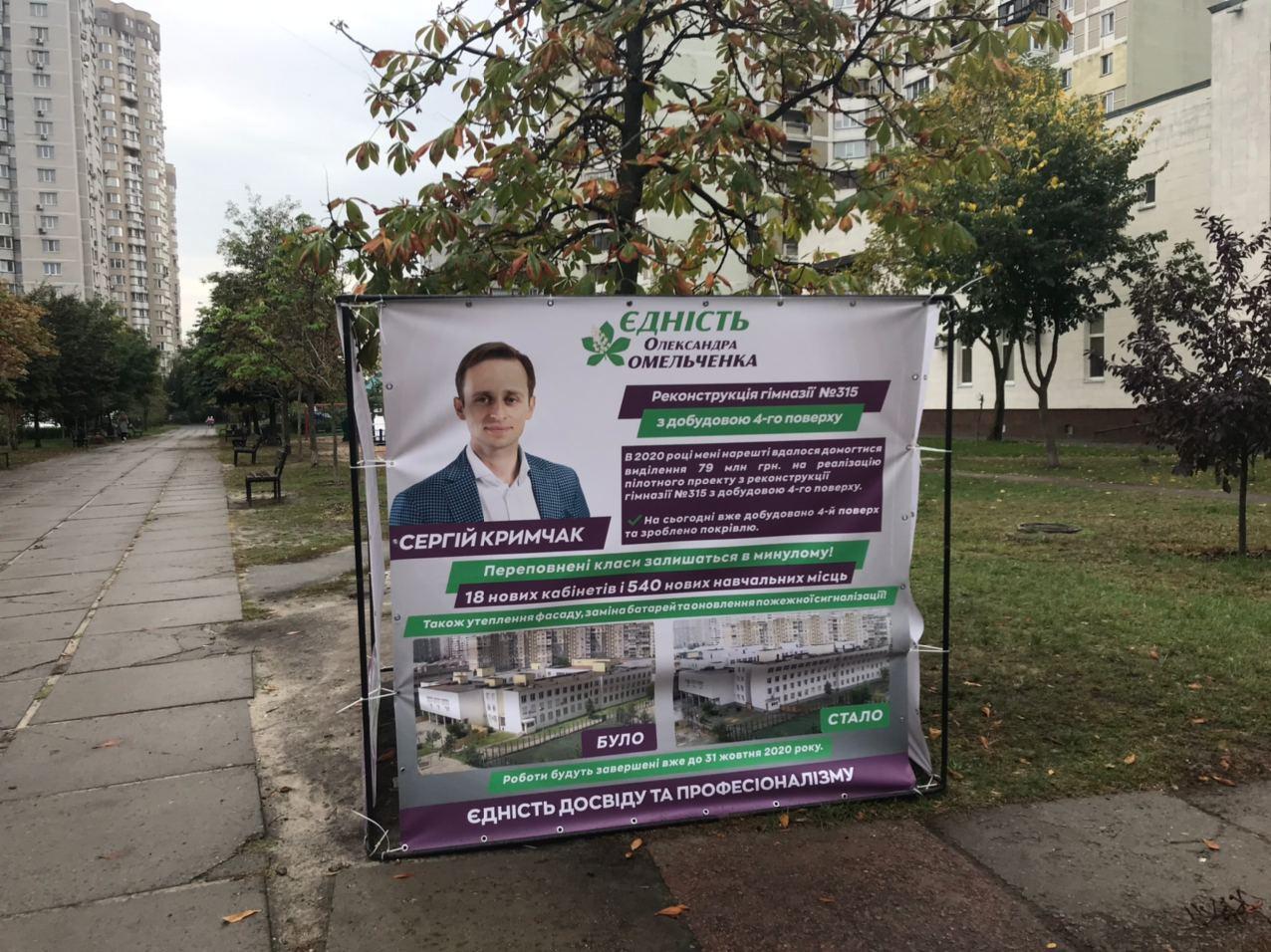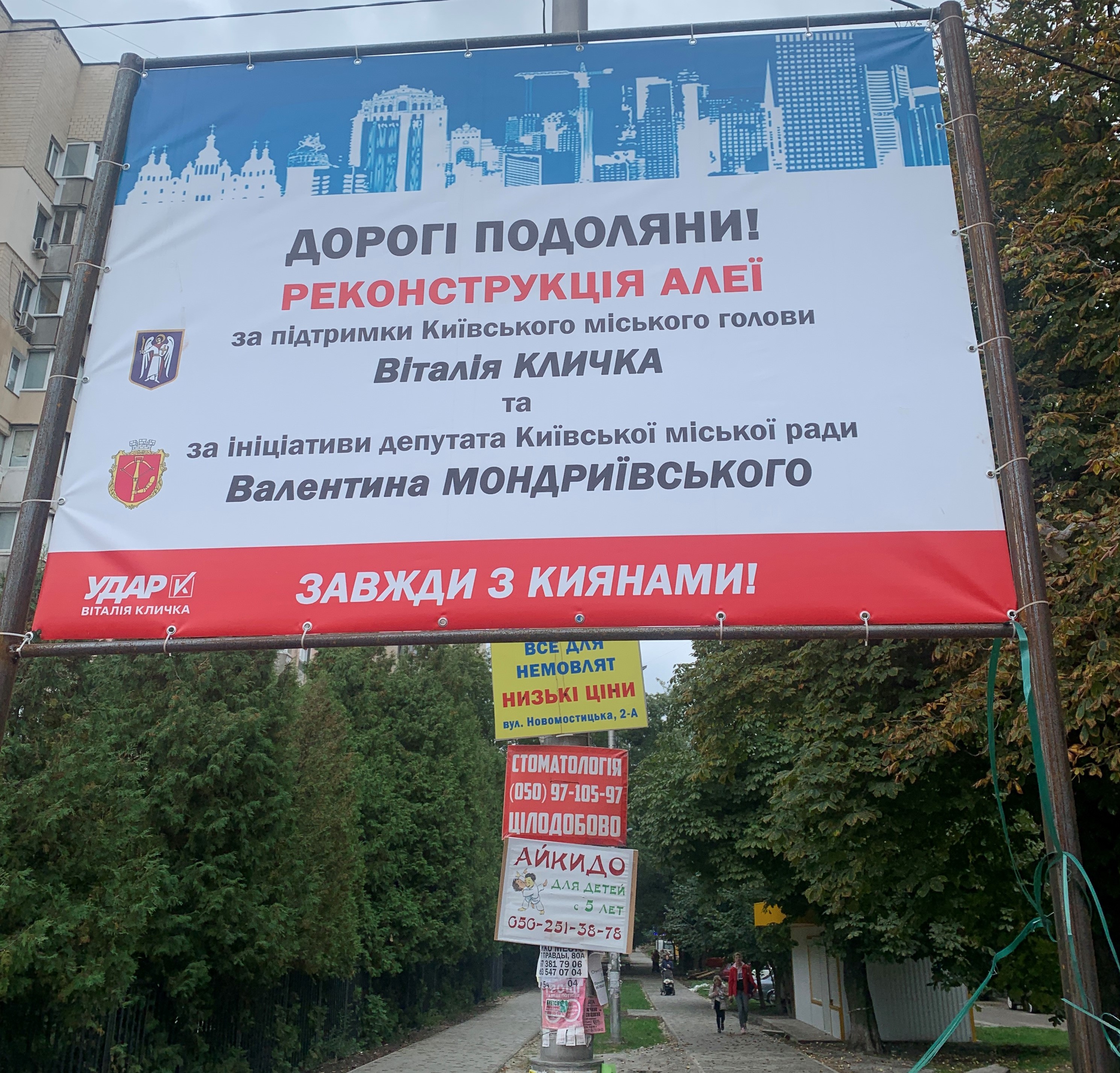 На Мостицькому масиві спостерігачка зафіксувала тимчасову конструкцію у вигляді інформаційної таблички з написом “Дорогі подоляни! Реконструкція алеї за підтримки Київського міського голови Віталія Кличка та за ініціативи депутата Київської міської ради Валентина Мондриївського”. Під написом – лого партії “УДАР Віталія Кличка” та гасло “Завжди з киянами”, яке партія використовує на місцевих виборах. Попри вимогу закону щодо вихідних даних на друкованій агітаційній продукції, інформація про друк, тираж та замовника на табличці відсутня. Крім того, в частині 1 статті 53 Виборчого кодексу зазначається, що кандидат, партія (організація партії) – суб’єкти виборчого процесу можуть на власний розсуд виготовляти матеріали передвиборної агітації за рахунок і в межах коштів свого виборчого фонду.