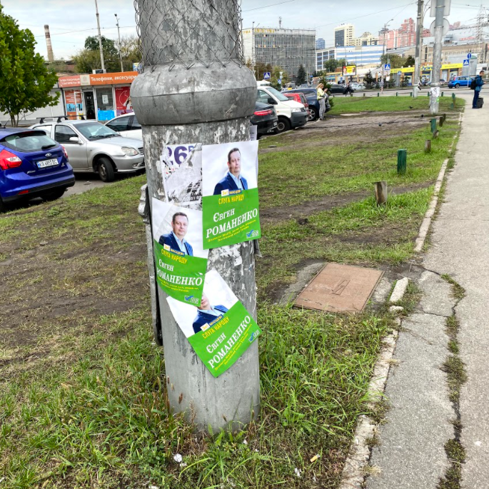 У Голосіївському районі міста Києва на вулиці Голосіївській спостерігачі ОПОРИ помітили кілька листівок, які були розміщені на опорах лінії електромереж. Йдеться, зокрема, про листівки без вихідних даних, з графією кандидата в депутати міської ради від партії “Слуга народу” Євгена Романенко. Листівки кандидата були також розміщені на будівлі громадської вбиральні, розташованої неподалік. На стовпі на вулиці Деміївській спостерігачі виявили листівку кандидата Ігоря Шпака, висунутого партією “Єдність”.