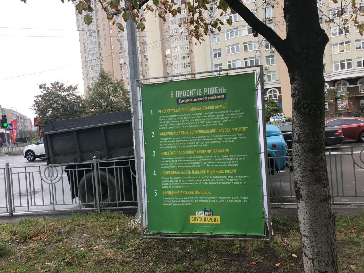 У Дарницькому районі міста Києва, на вулиці Драгоманова, було зафіксовано агітаційні куби з політичною агітацією на зелених зонах. Так, на кубі з логотипом партії “Єдність” зображений кандидат в депутати у ТВО №2 Сергій Кримчак. На одній з граней куба депутат звітує, як ремонтується школа на гроші, яких йому “вдалося домогтися”. На кубі неподалік, однак вже від партії “Слуга Народу”, представлені “5 проєктів рішень Дарницького району”, які політична сила обіцяє втілити в життя.