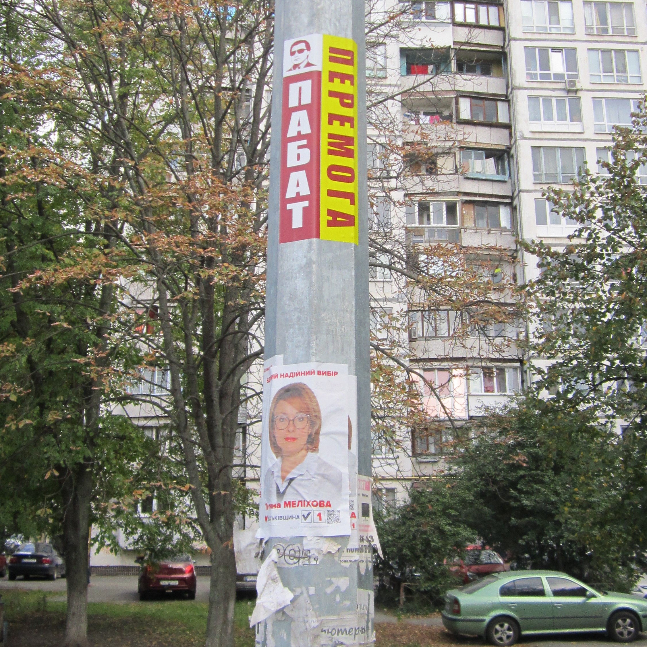 На вулиці Потапова спостерігачка зафіксувала листівки від політичної партії “Перемога Пальчевського” та кандидатки від “Батьківщина” Тетяни Меліхової, що були закріплені на одній з електроопор.