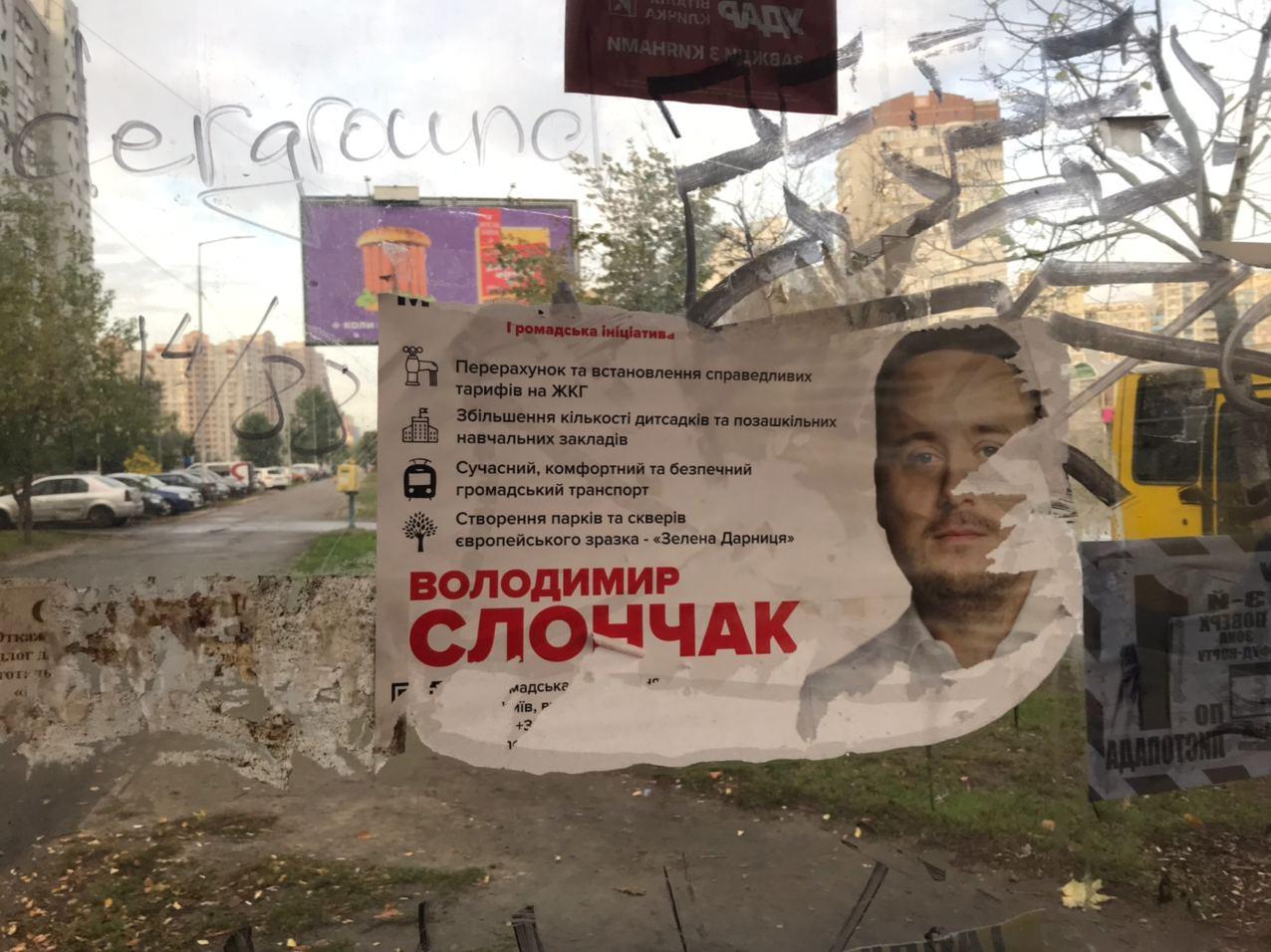 На зупинці громадського транспорту на вулиці Анни Ахматової спостерігачі виявили листівки кандидата від партії “УДАР Віталія Кличка” Ігоря Балація та пошкоджену листівку кандидата від партії “Батьківщина” Володимира Слончака. На електроопорі неподалік розмістили агітку з зображенням кандидата від партії “Слуга народу” Ігоря Конопелька.