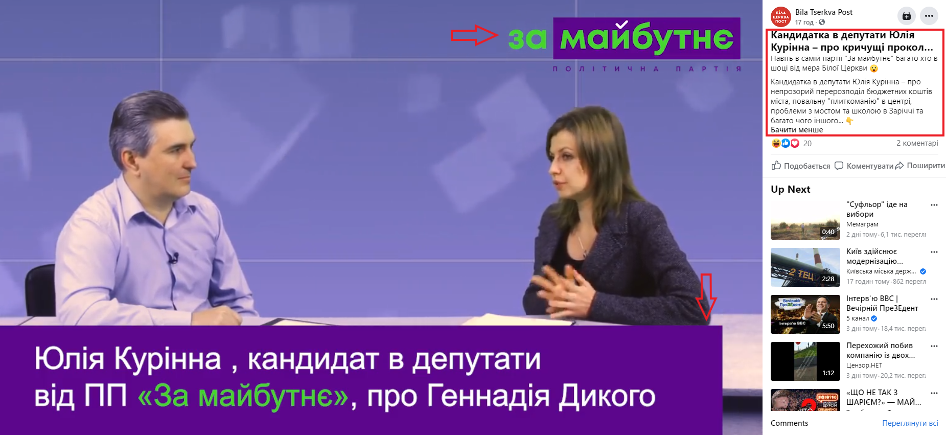 У соціальній мережі Фейсбук на сторінці «Bila Tserkva Post» 19 жовтня опублікували інтерв’ю із чинною кандидаткою в місцеві депутати від політичної партії «За майбутнє» Юлією Курінною. У ньому на запитання ведучого щодо діяльності місцевої Білоцерківської влади Юлія Курінна досить критично оцінювала її дії та не підтримувала міського голову Геннадія Дикого. Також опис публікації носить маніпулятивний характер та оціночні судження щодо висловів кандидатки. Відео на сторінці «Bila Tserkva Post» було марковане логотипом політсили «За майбутнє» та мало вигляд новини, що стосувалася нещодавніх подій.