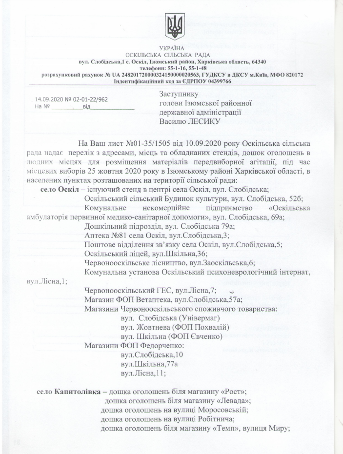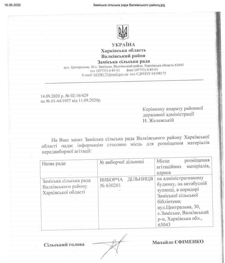«Виборчий кодекс має чіткі заборони, щодо розміщення агітаційних матеріалів. Виділення органами місцевого самоврядування цих місць на автобусних зупинках та з використанням приміщень державної та комунальної власності може призвести до порушення законодавства. Тому ми звернулися зі зверненням щодо перегляду окремих місць для розміщення агітаційних матеріалів», - відмітив координатор спостереження Громадянської мережі ОПОРА за виборами у Харківській області.