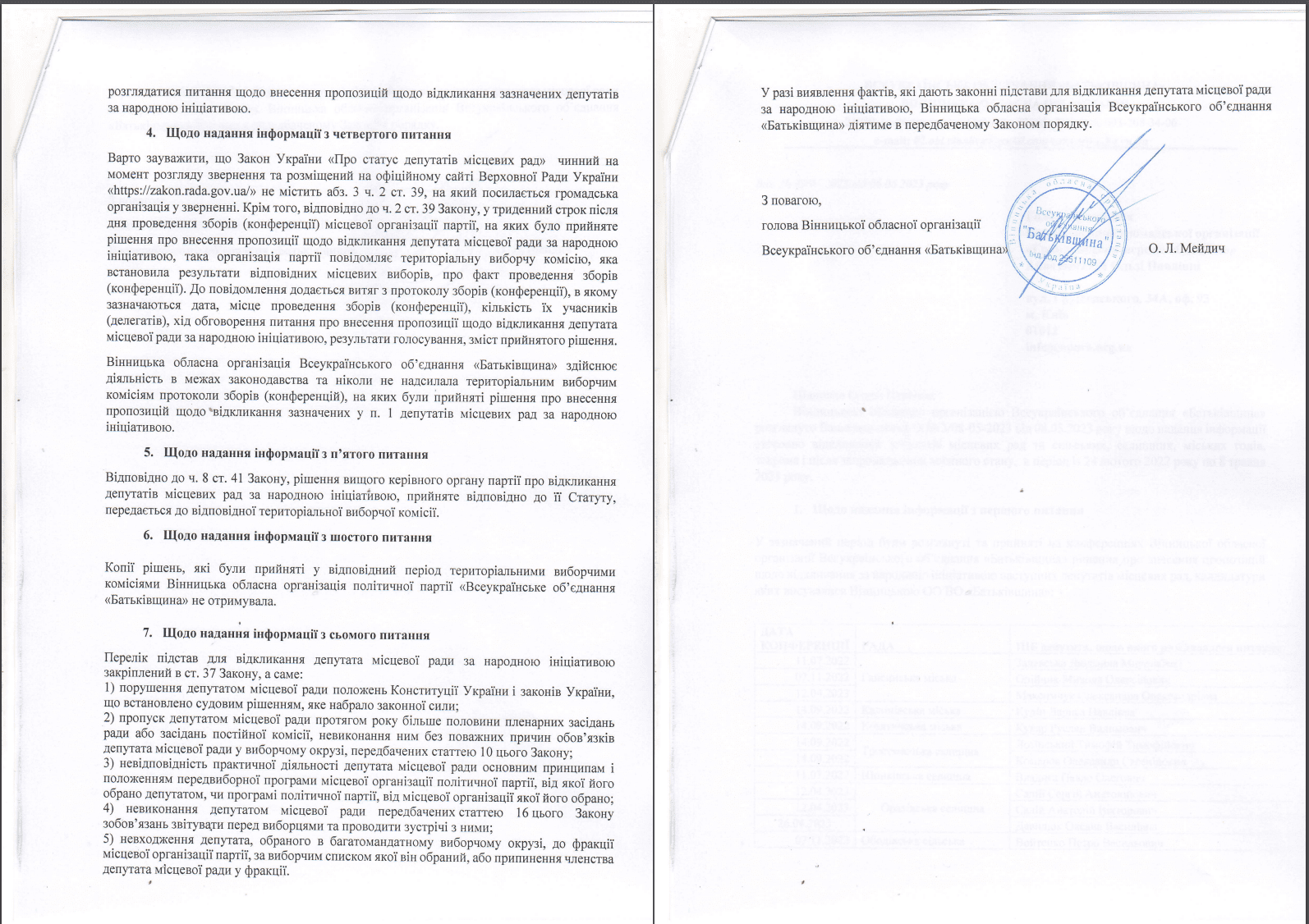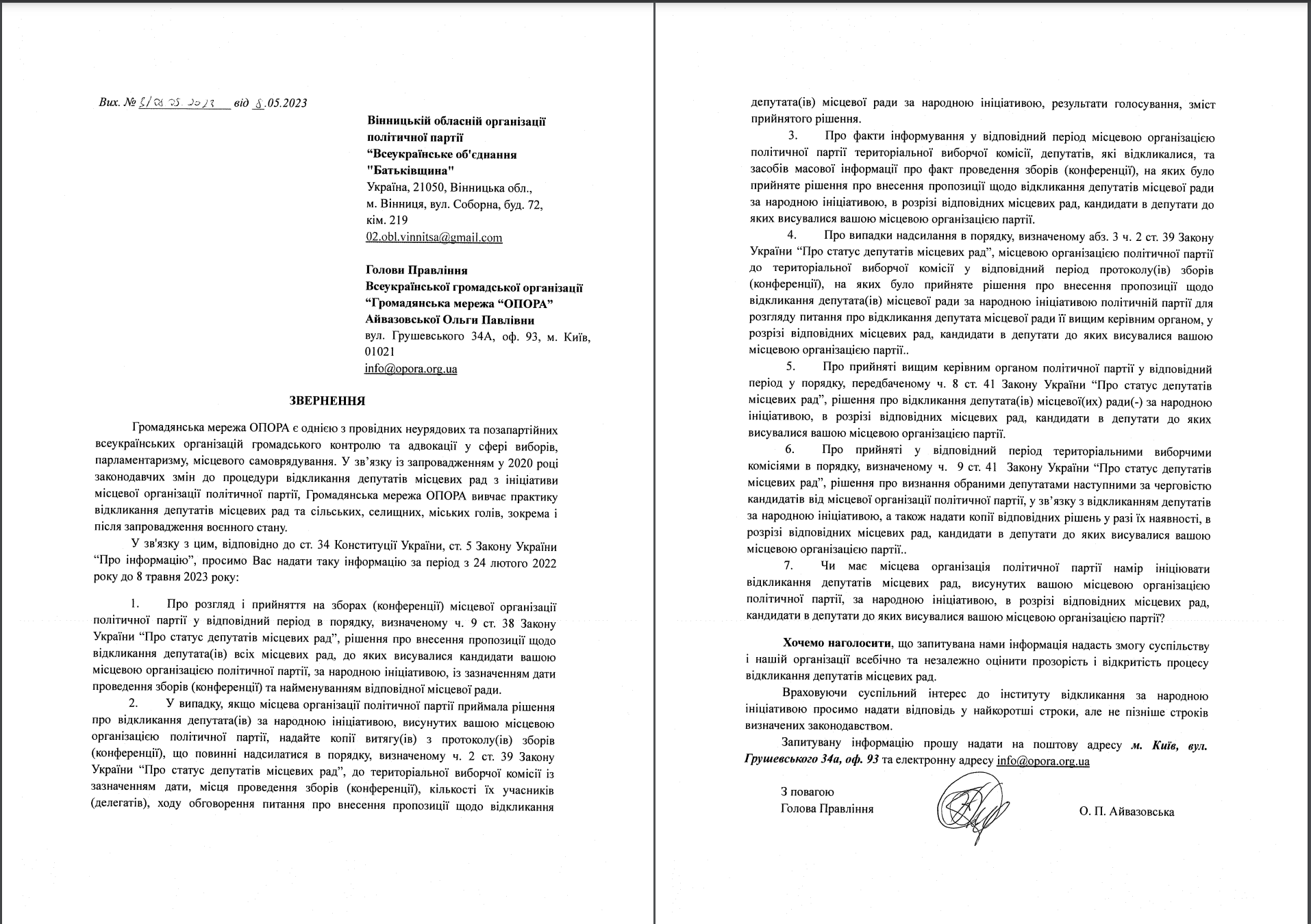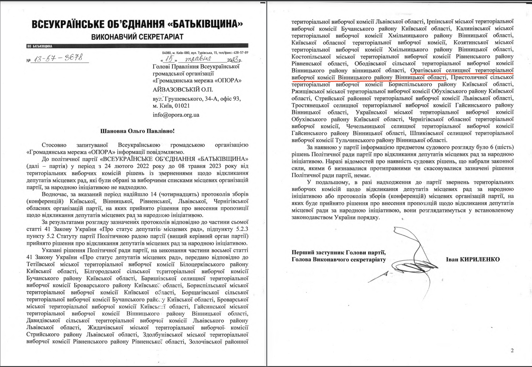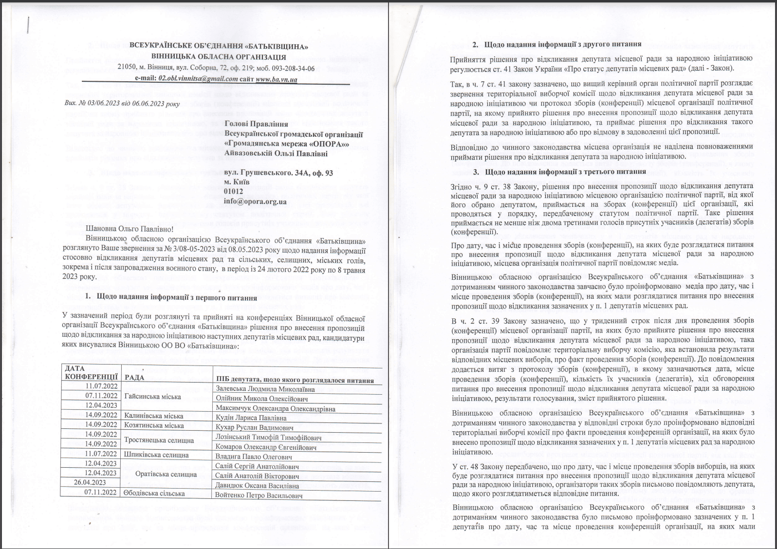 ОПОРА також отримала відповідь від виконавчого секретаріату ВО “Батьківщина”, у якій вказано, що до партії з 24 лютого 2022 року надійшло 14 протоколів зборів від 5 обласних організацій, на яких прийнято рішення про внесення пропозиції щодо відкликання депутатів. Зокрема, йдеться і про Оратівську селищну раду.