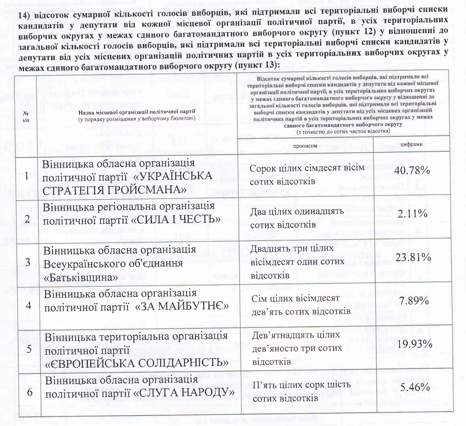 - “Українська Стратегія Гройсмана” — 40,78% (10 мандатів)