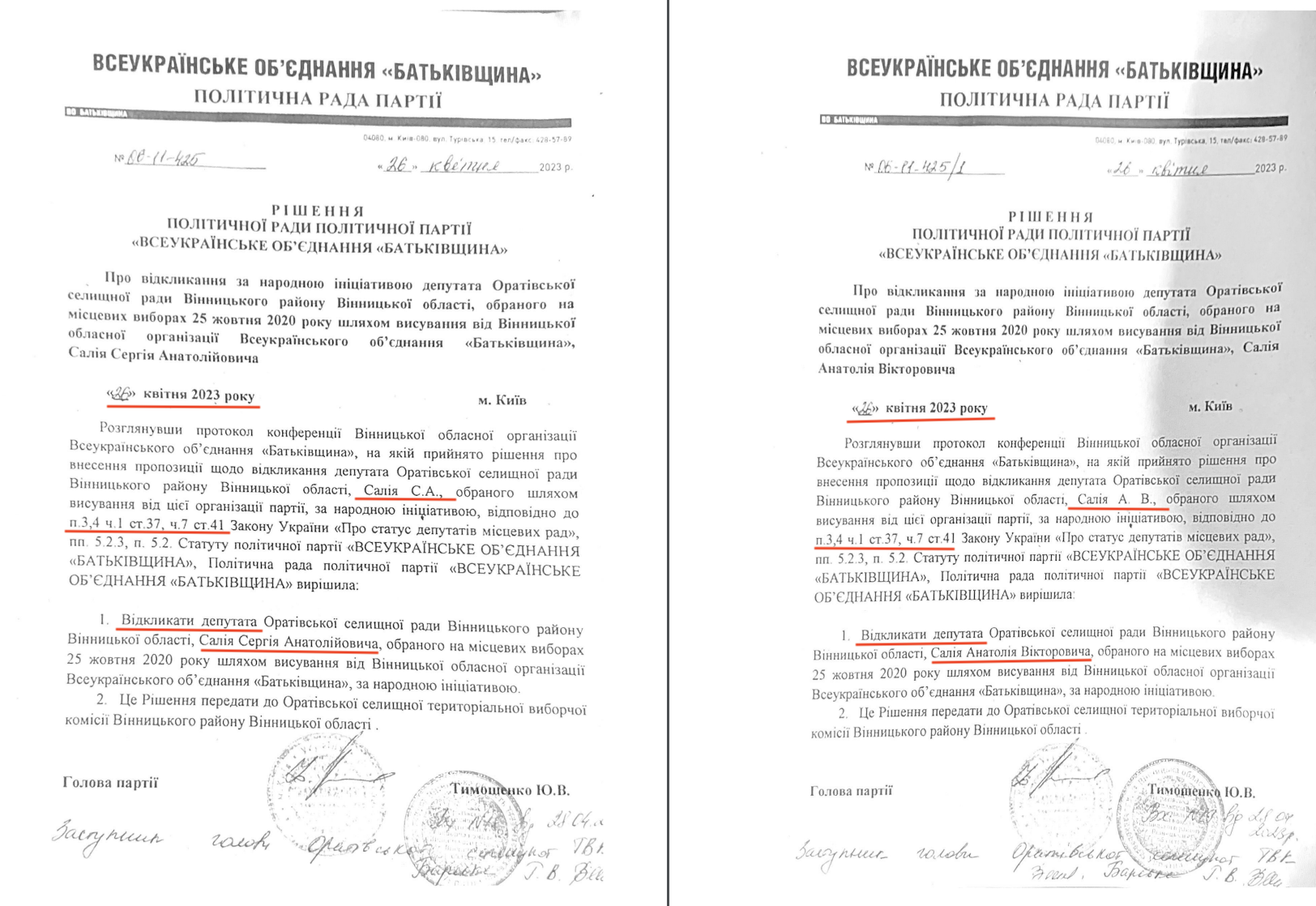 І справді, рішення політичної ради ВО “Батьківщина” щодо відкликання обох депутатів прийняте 26 квітня. Його причиною називають невідповідність практичної діяльності депутатів принципам і положенням передвиборної програми чи програми політичної партії, від якої їх обрали, а також невиконання зобов’язань звітувати перед виборцями та проводити зустрічі з ними. Анатолій та Сергій Салії ці звинувачення категорично заперечують.