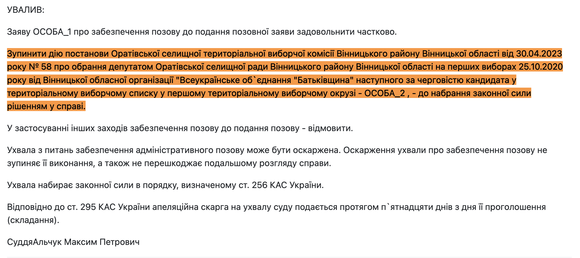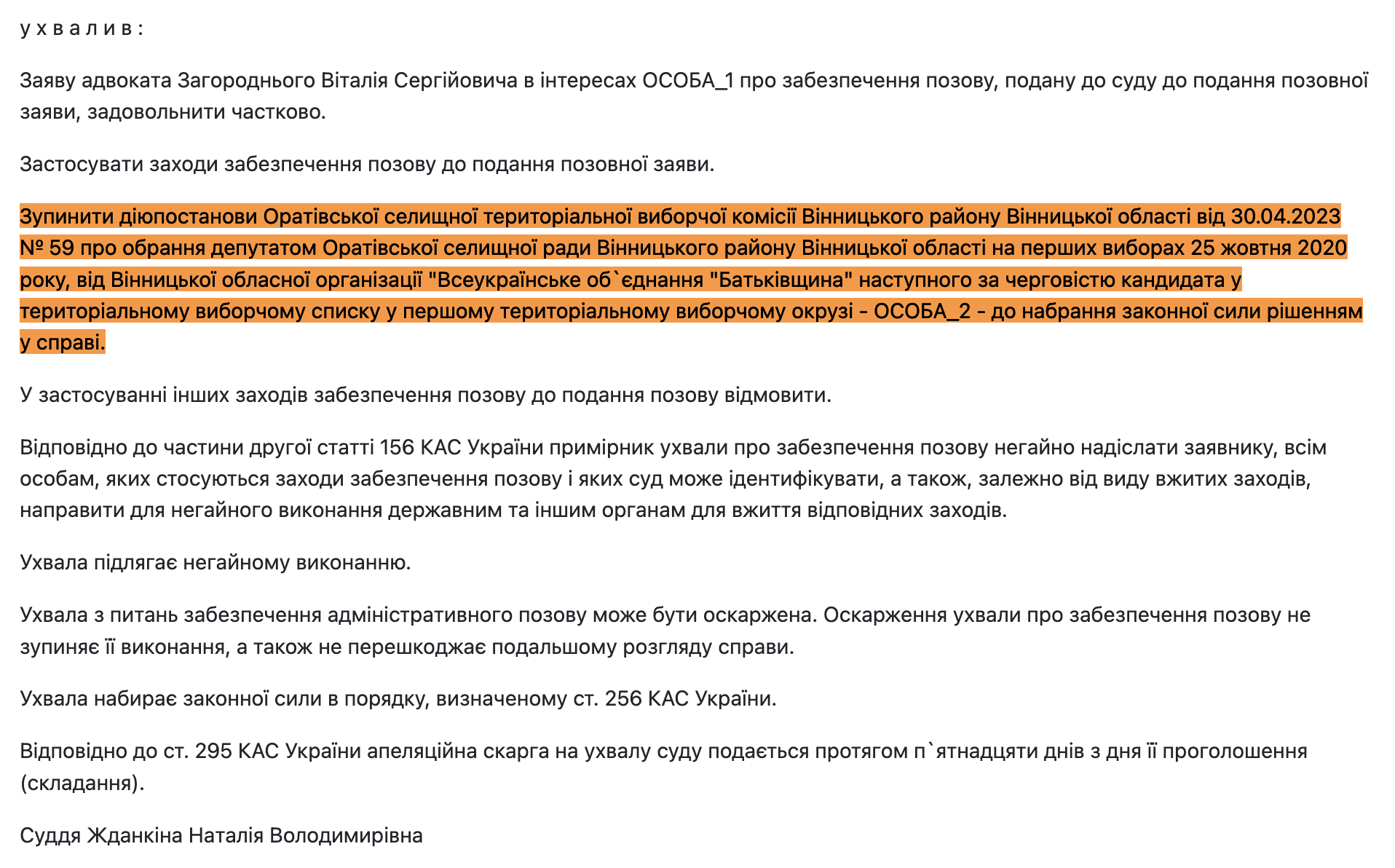 3 травня адвокат депутатів Саліїв подав заяву про забезпечення позову та домігся зупинення дії постанови Оратівської ТВК про обрання наступного за черговістю кандидата до набрання законної сили рішенням у справі. Рішення щодо Сергія Салія та зупинення обрання Тетяни Тімохіної суд прийняв 4 травня, а щодо Анатолія Салія та зупинення обрання Валентини Розумнюк — 5 травня. Ухвала суду підлягає негайному виконанню.