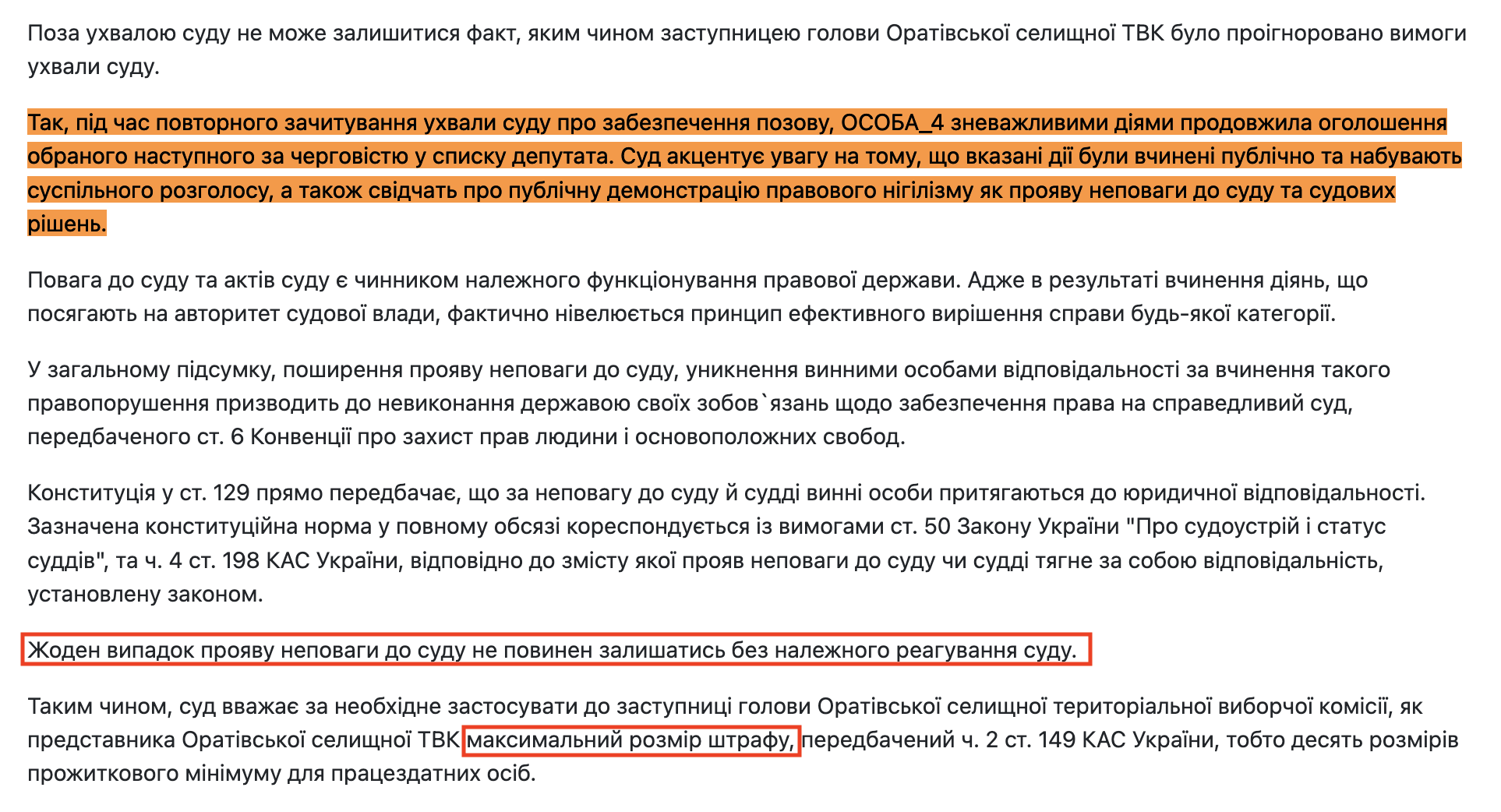 Цікаво, що навіть ухвала суду не змогла заблокувати відкликання депутатів. Крім того, на заступницю голови місцевої ТВК, яка не виконала рішення суду, наклали два штрафи загальним розміром у понад 53 тисячі гривень.