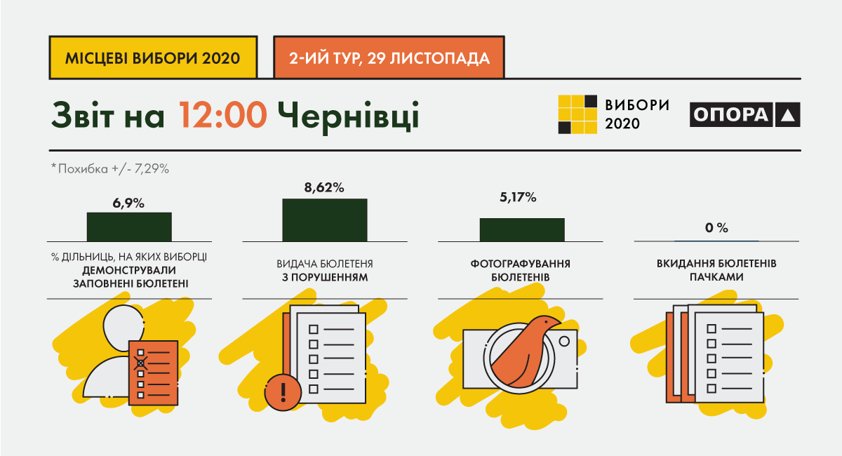 Позитивної оцінки, за повідомленнями спостерігачів ОПОРИ, заслуговує відсутність спроб незаконного вкидання виборчих бюлетенів (пачками) в скриньки для голосування станом на 12:00.