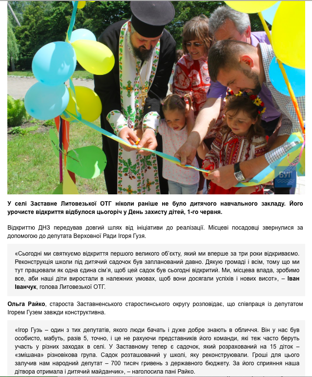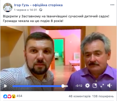 Зокрема, 1 червня 2019 року на офіційній сторінці народного депутата Ігоря Гузя у Facebook з’явилося відео про відкриття дошкільного навчального закладу у с. Заставне Іваничівського району. На відео нардеп наголошує, що кошти на добудову закладу йому вдалось «залучити» з державного бюджету.