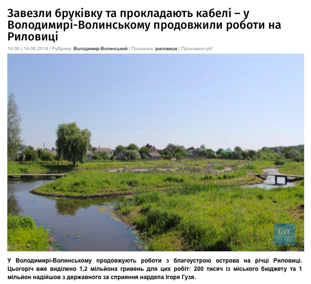 14 червня в інтернет-виданні «Буг» було опубліковано матеріал «Завезли бруківку та прокладають кабелі – у Володимирі-Волинському продовжили роботи на Риловиці». У публікації йдеться про те, що для благоустрою острова на річці Риловиця 1 мільйон гривень надійшло з державного бюджету «за сприяння» Ігоря Гузя.