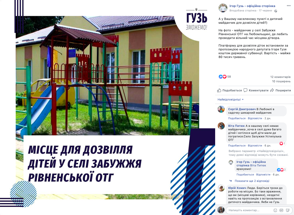17 червня на сторінці Ігоря Гузя у Facebook з’явився допис про новий дитячий майданчик у с. Забужжя Рівненської ОТГ на Любомльщині. У публікації йдеться, що «платформу для дозвілля діток встановили за пропозицією народного депутата Ігоря Гузя коштом державної субвенції. Вартість – майже 80 тисяч гривень».