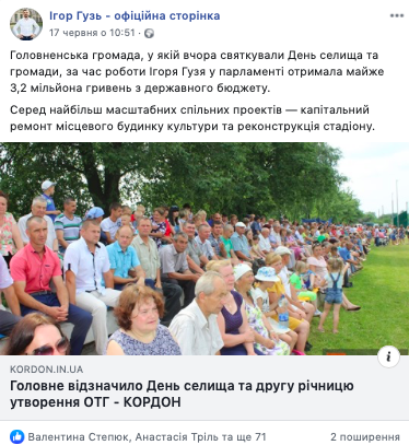У цей же день на сторінці парламентаря у Facebook було опубліковано матеріал за результатами святкування Дня Головненської селищної ОТГ. У публікації наголошується, що громада отримала з державного бюджету 3,2 мільйона гривень за сприяння Ігоря Гузя.
