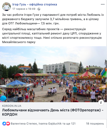 17 червня також в одномандатному виборчому окрузі №19 відбувалось святкування Дня міста Любомль. За результатами святкування на сторінці Ігоря Гузя, який взяв участь у заході, у Facebook з’явився допис про те, що «за час роботи Ігоря Гузя у парламенті для потреб міста Любомль із державного бюджету залучили 3,7 мільйона гривень, а в цілому для ОТГ Любомльщини – 7,5 млн. грн; серед найбільш масштабних проектів – реконструкція центральної площі, капітальний ремонт даху ЦРЛ, спорудження у місті спорткомлексу тощо».