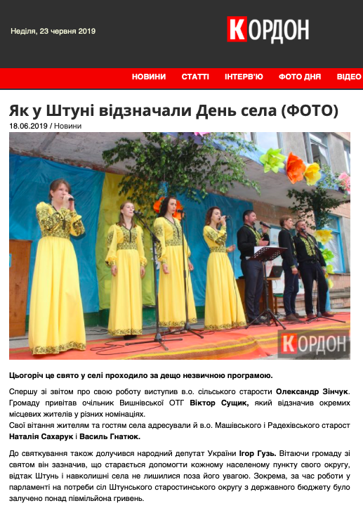 18 червня в інтернет-виданні «Кордон» та на офіційній сторінці нардепа Ігоря Гузя у Facebook з’явилися публікації про відзначення Дня села Штунь. У матеріалах наголошувалося, що «у Штунський старостинський округ нардеп з державного бюджету залучив понад півмільйона гривень».