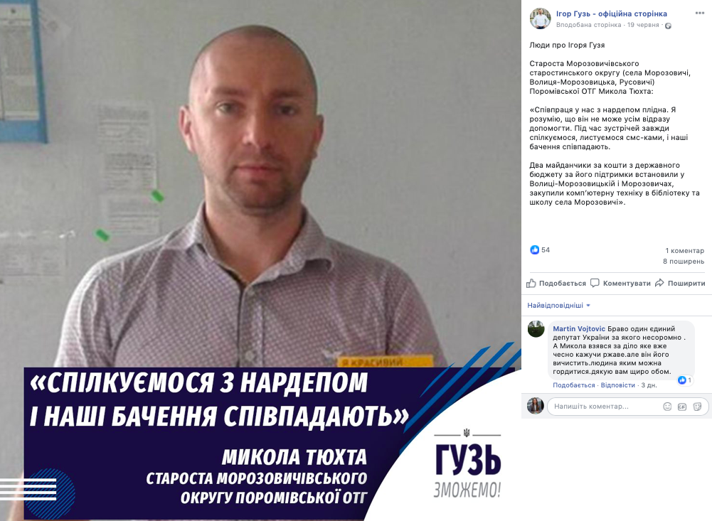 На сторінці народного депутата у Facebook 19 червня з’явився черговий допис із рубрики «Люди про Ігоря Гузя». Староста Морозовичівського старостинського округу Поромівської ОТГ Микола Тюхта зазначив: «Співпраця у нас з нардепом плідна. Я розумію, що він не може усім відразу допомогти. Під час зустрічей завжди спілкуємося, листуємося смс-ками, і наші бачення співпадають. Два майданчики за кошти з державного бюджету за його підтримки встановили у Волиці-Морозовицькій і Морозовичах, закупили комп’ютерну техніку в бібліотеку та школу села Морозовичі».