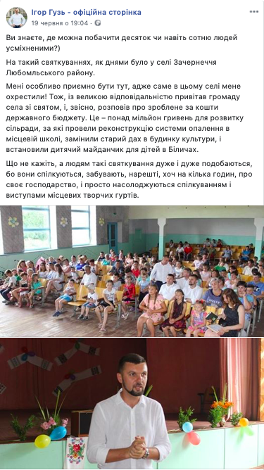 Цього ж дня Ігор Гузь побував на святкуваннях у с. Зачернеччя Любомльського району. На його сторінці у Facebook з’явився допис про те, що нардепу вдалось зробити в цій громаді за кошти з державного бюджету.