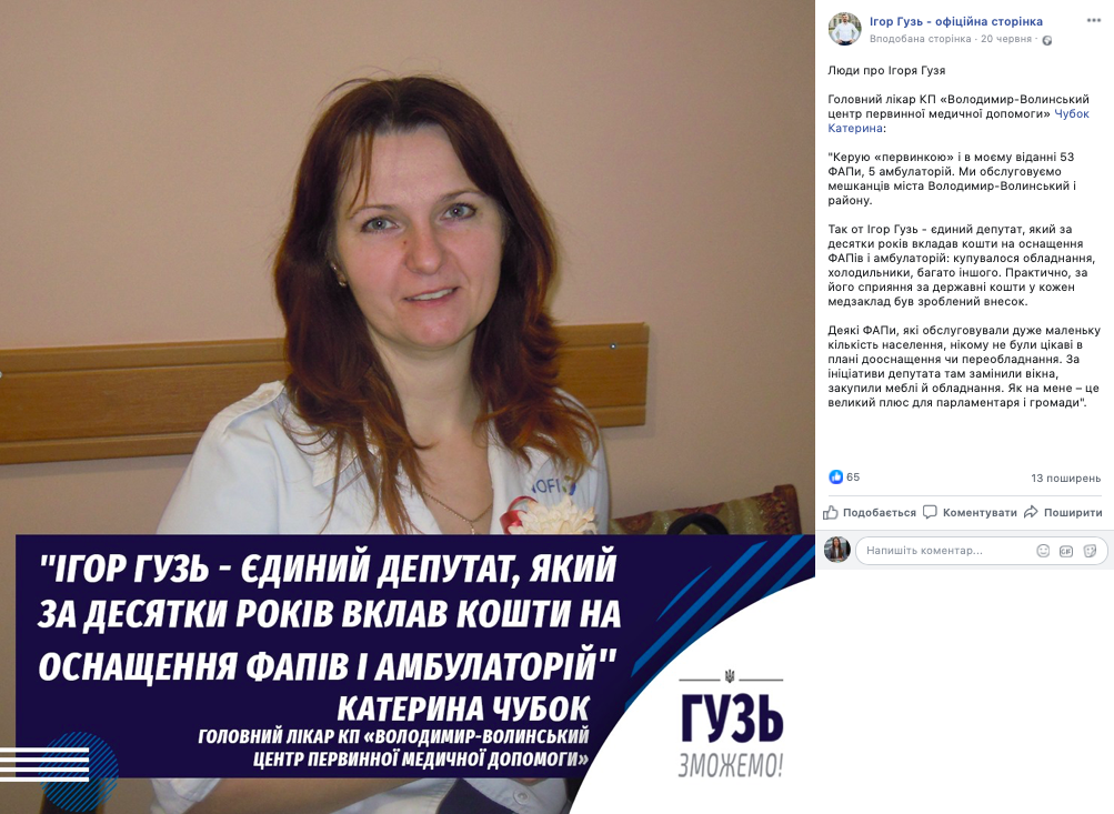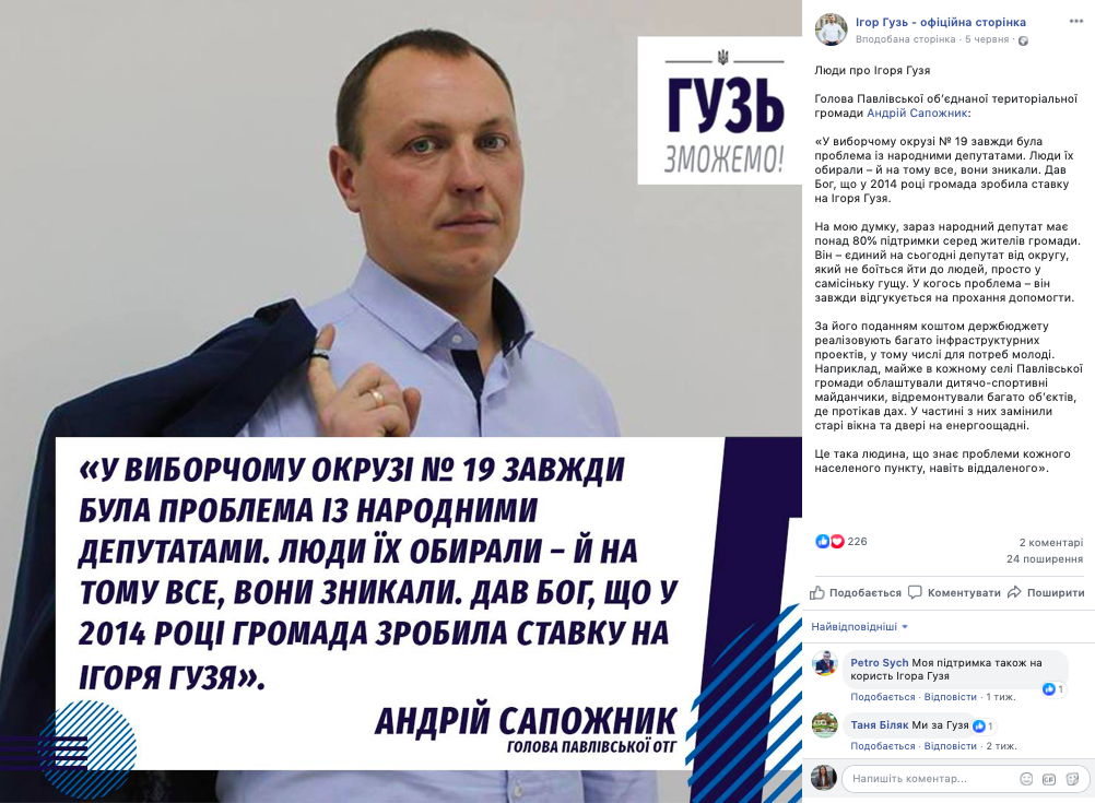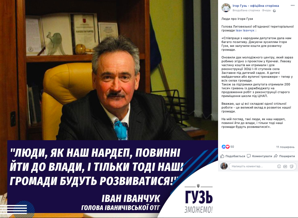 22 червня на сторінці народного депутата Ігоря Гузя у Facebook з’явився ще один допис із рубрики «Люди про Ігоря Гузя». Зокрема, було опубліковано цитату голови Литовезької ОТГ Івана Іванчука.