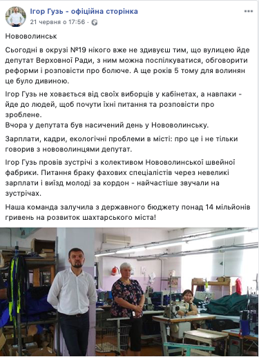 21 червня на сторінці Ігоря Гузя у Facebook з’явився допис про його візит на швейну фабрику у Нововолинську. У дописі також згадується, що команда Ігоря Гузя залучила з державного бюджету понад 14 мільйонів гривень на розвиток шахтарського міста.