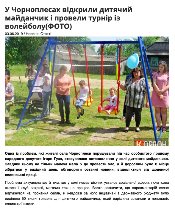 3 червня 2019 року на сторінці нардепа у Facebook, а також на сайті інтернет-видання «Кордон» з’явився матеріал про відкриття дитячого майданчика у с. Чорноплеси Любомльського району. У публікації йдеться, що за ініціативи Ігоря Гузя «з державного бюджету було виділено 50 тисяч гривень для дитячого майданчика, який вирішили встановити неподалік колишньої школи».