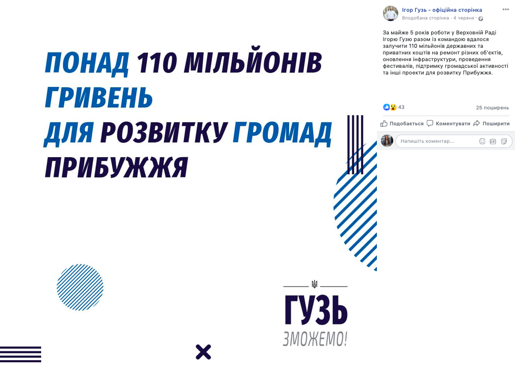 Разом з тим, 4 червня на сторінці нардепа у Facebook було опубліковано допис про те, що «за майже 5 років роботи у Верховній Раді Ігорю Гузю разом із командою вдалося залучити 110 мільйонів державних та приватних коштів на ремонт різних об'єктів, оновлення інфраструктури, проведення фестивалів, підтримку громадської активності та інші проекти для розвитку Прибужжя».