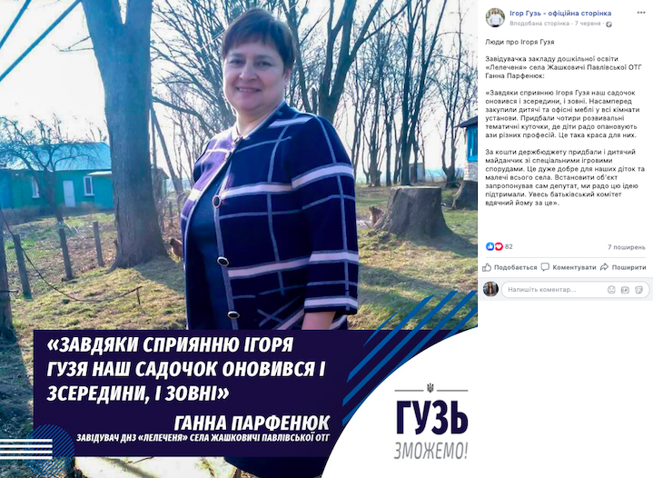 7 червня 2019 року на офіційній сторінці нардепа у Facebook опублікували ще один допис із рубрики «Люди про Ігоря Гузя». Цього разу про кошти з державного бюджету «за сприяння» Ігоря Гузя розповідає завідувачка закладу дошкільної освіти «Лелеченя» села Жашковичі Павлівської ОТГ Ганна Парфенюк.