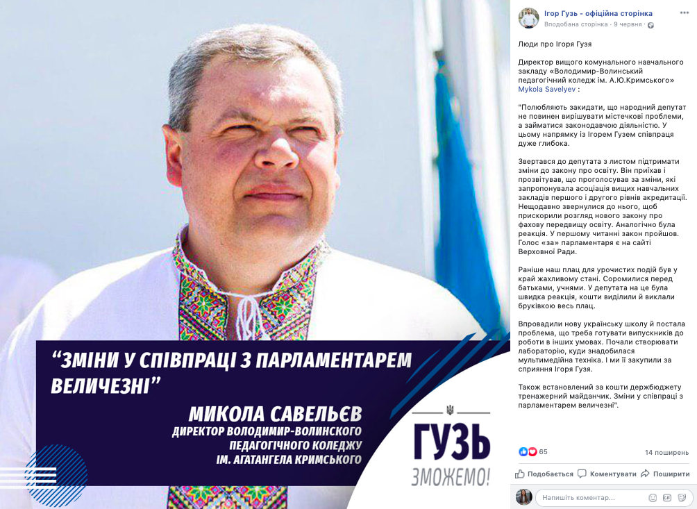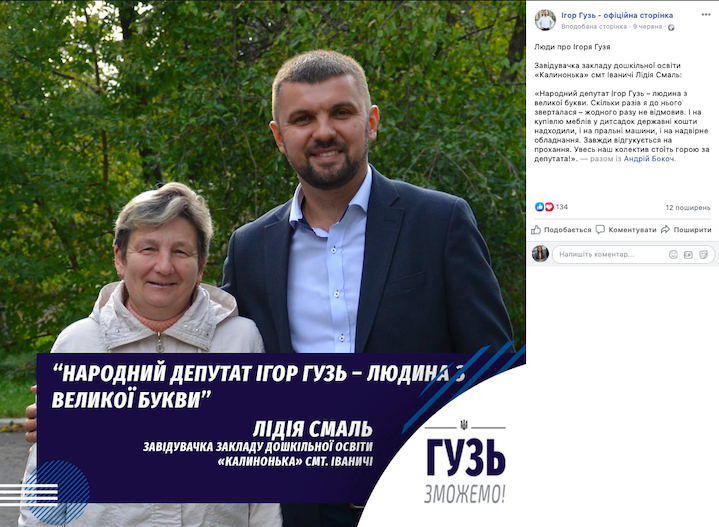 Цього ж дня на сторінці Ігоря Гузя у Facebook з’явилась і цитата завідувачки закладу дошкільної освіти «Калинонька» смт Іваничі Лідія Смаль: «Народний депутат Ігор Гузь – людина з великої букви. Скільки разів я до нього зверталася – жодного разу не відмовив. І на купівлю меблів у дитcадок державні кошти надходили, і на пральні машини, і на надвірне обладнання. Завжди відгукується на прохання. Увесь наш колектив стоїть горою за депутата!». Допис також стосувався рубрики «Люди про Ігоря Гузя».
