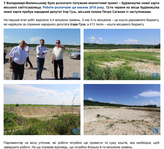 В інтернет-виданні «Буг» 13 червня 2019 року з’явилась публікація «На добудову нового сміттєзвалища у Володимирі-Волинському потрібно 6 мільйонів гривень». На перший етап робіт виділили 5,4 мільйони гривень. З них 5-ть мільйонів – це кошти державного бюджету, які надійшли «за сприяння» народного депутата Ігоря Гузя, а 413 тисяч – кошти місцевого бюджету.