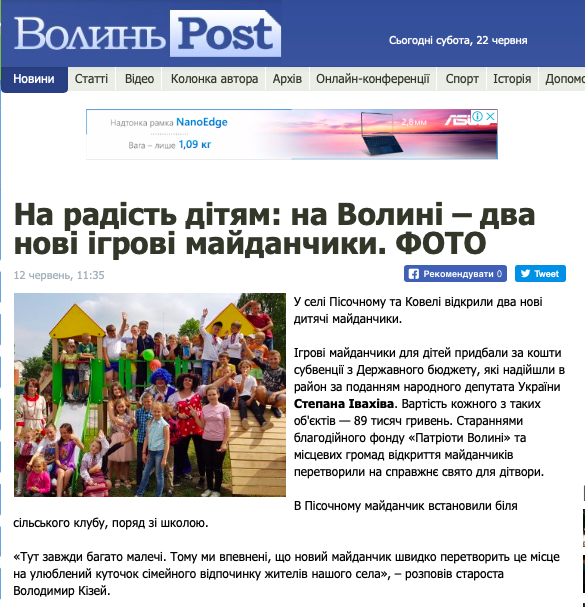 Так, 12 червня в місцевому інтернет-виданні «ВолиньPost» з’явилась публікація про те, що у с. Пісочному та м. Ковель відкрили два нові дитячі майданчики. Ігрові майданчики для дітей придбали за кошти субвенції з Державного бюджету, які надійшли в район за поданням народного депутата України Степана Івахіва. Вартість кожного з таких об'єктів – 89 тисяч гривень.