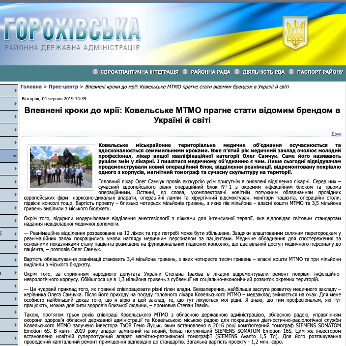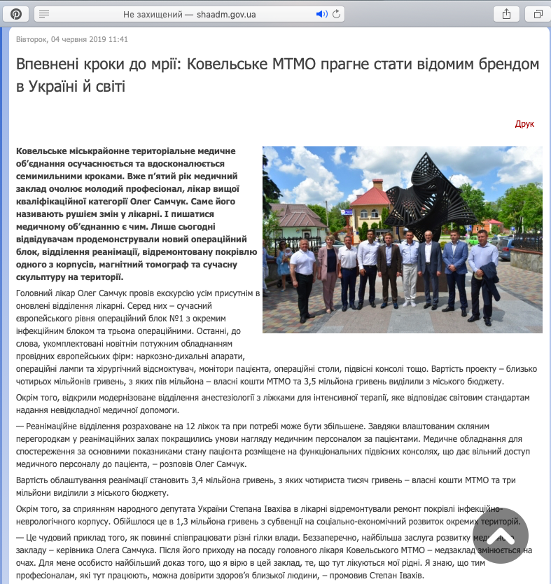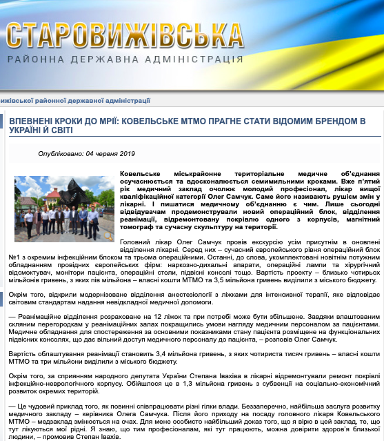 Раніше, 4 червня, на офіційних сайтах Шацької, Горохівської та Старовижівської районних державних адміністрацій з’явились однакові публікації під назвою «Впевнені кроки до мрії: Ковельське МТМО прагне стати відомим брендом в Україні й світі». У матеріалі наголошується, що «за сприяння» народного депутата України Степана Івахіва в лікарні здійснили ремонт покрівлі інфекційно-неврологічного корпусу. Обійшлося це в 1,3 мільйона гривень субвенції на соціально-економічний розвиток окремих територій.