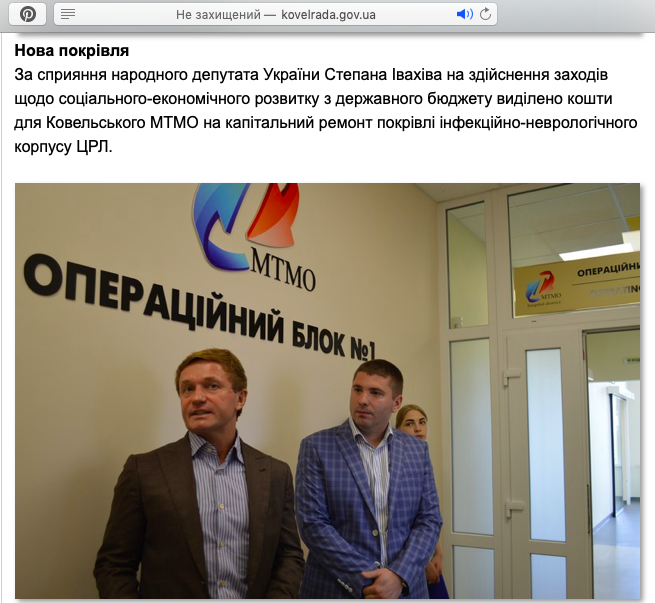 Разом з тим, на офіційному сайті Ковельської міської ради з’явилась схожа публікація під назвою «Народний депутат України Степан Івахів: вірю Ковельській лікарні, довіряю її спеціалістам». У ній також йдеться про те, що «за сприяння» народного депутата України Степана Івахіва на здійснення заходів щодо соціально-економічного розвитку з державного бюджету було виділено кошти для Ковельського МТМО на капітальний ремонт покрівлі інфекційно-неврологічного корпусу ЦРЛ.
