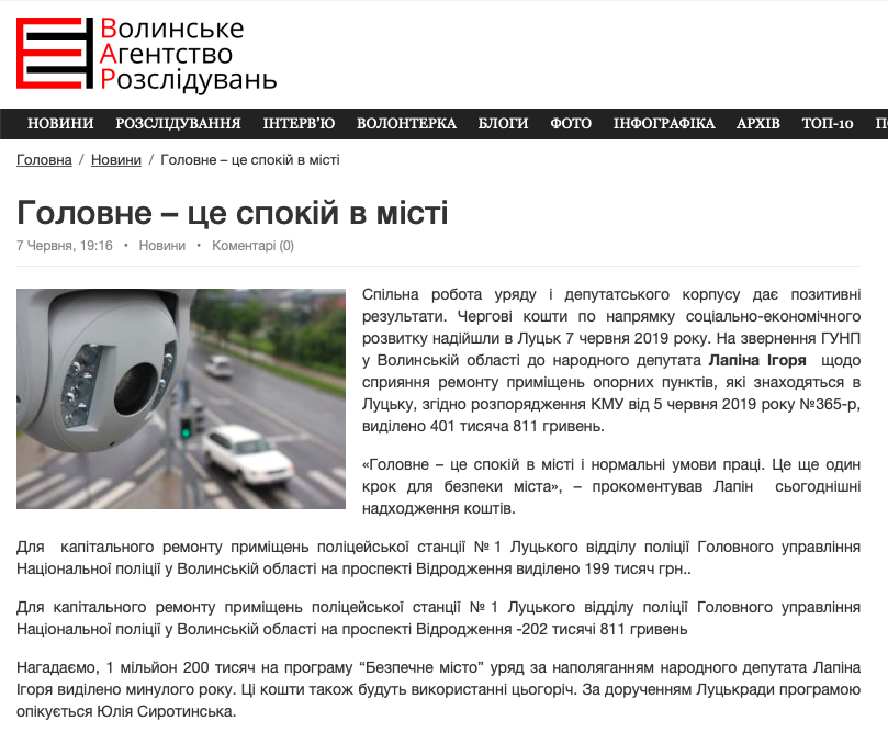 У публікації йдеться, що для капітального ремонту приміщень поліцейської станції №1 Луцького відділу поліції Головного управління Національної поліції у Волинській області на проспекті Відродження виділено 199 тис. грн; для капітального ремонту приміщень поліцейської станції №1 Луцького відділу поліції Головного управління Національної поліції у Волинській області на проспекті Відродження – 202 тис. 811 грн. Також у публікації згадується, що 1 млн 200 тис. грн на програму «Безпечне місто» уряд «за наполяганням» народного депутата Ігоря Лапіна виділив минулого року.