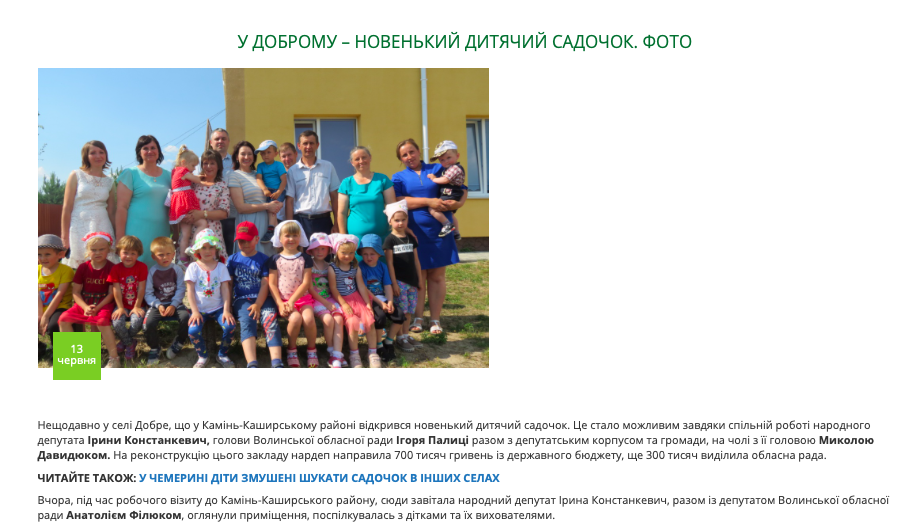 Так, 13 червня 2019 року на офіційному сайті народного депутата Ірини Констанкевич («Українське об’єднання патріотів – УКРОП», ОВО №23) було опубліковано інформацію, що у селі Добре Камінь-Каширського району відкрився новенький дитячий садочок. Це стало можливим завдяки спільній роботі народного депутата Ірини Констанкевич, голови Волинської обласної ради Ігоря Палиці разом з депутатським корпусом та громадою на чолі з її головою Миколою Давидюком. На реконструкцію цього закладу нардеп «направила» 700 тис. грн із державного бюджету, ще 300 тис. грн виділила обласна рада.