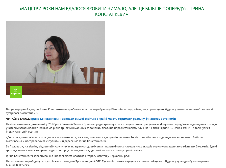 20 червня 2019 року на цьому ж сайті з’явилась публікація про робочий візит народного депутат Ірини Констанкевич в Ківерцівський район Волинської області. Під час зустрічі нардепа з громадою Тростянецької ОТГ наголошувалось, що за підтримки Ірини Констанкевич на ремонт місцевого Будинку культури було залучено більше 800 тис. грн.