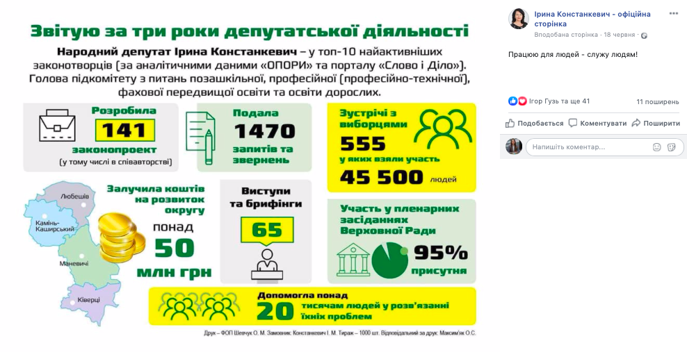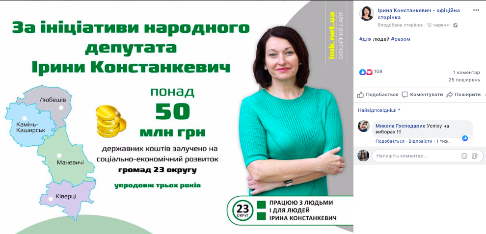 Крім того, 12 та 18 червня на офіційній сторінці народного депутата Ірини Констанкевич у Facebook було опубліковано схожі публікації про те, що за ініціативи нардепа понад 50 млн грн державних коштів було залучено на соціально-економічний розвиток громад 23 округу упродовж трьох років її депутатської діяльності.
