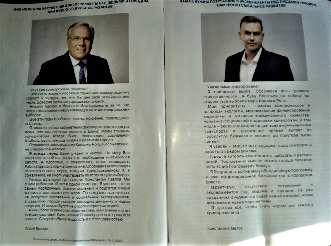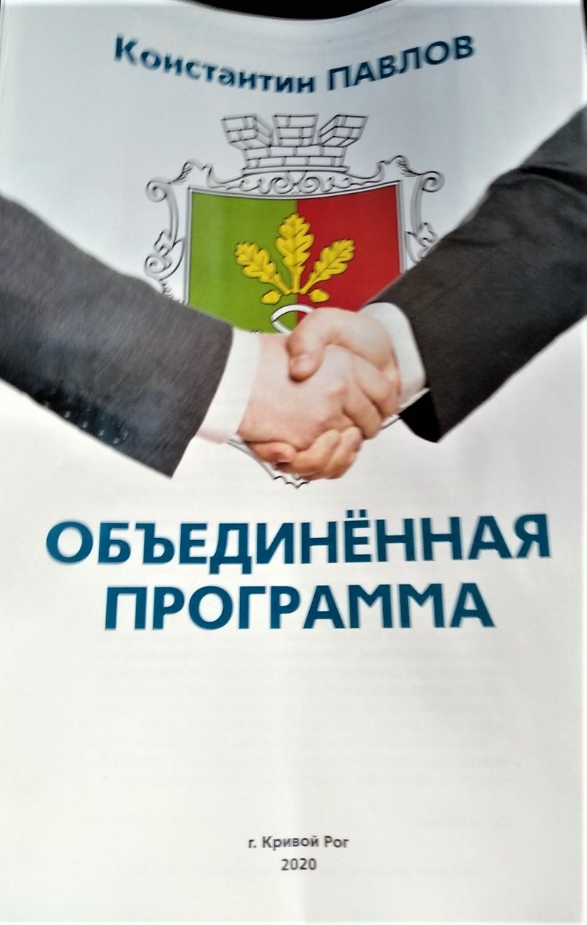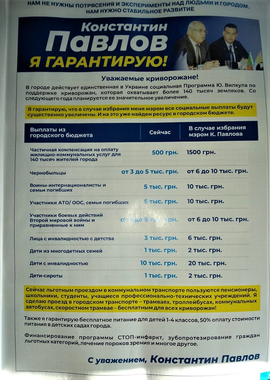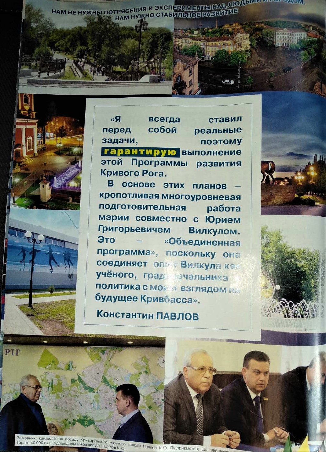 Друковані матеріали Костянтина Павлова роздають агітатори у брендованих жилетах на вулицях Кривого Рогу. На першій сторінці «Об’єднаної програми» надруковано звернення Юрія Вілкула, в якому він вихваляє якості кандидата.
