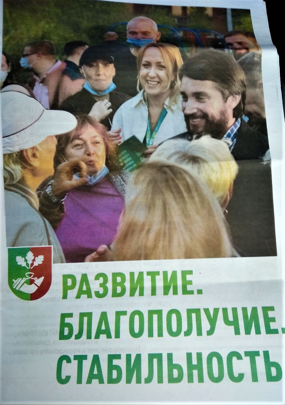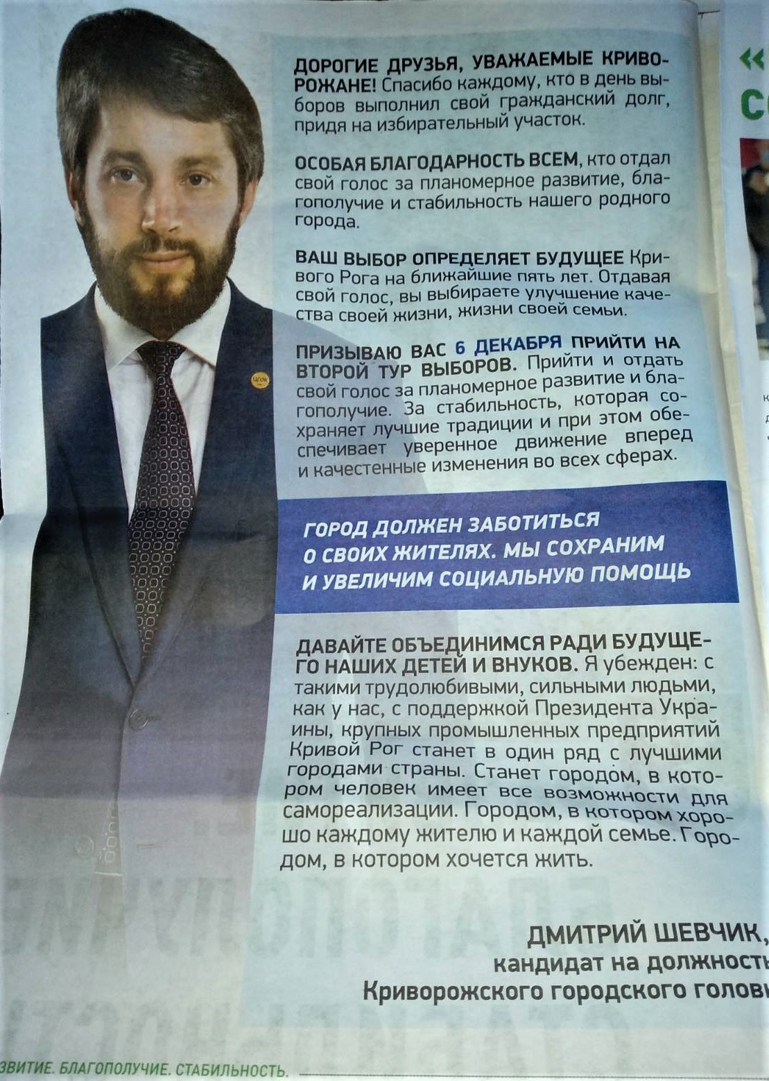 Агітаційну газету Дмитра Шевчика «Розвиток. Добробут. Стабільність» роздають на вулицях та розносять по будинках. Газета видається російською мовою. На першій шпальті Дмитро Шевчик дякує тим, хто проголосував за нього 25 жовтня і закликає прийти на вибори 6 грудня. Закликає об’єднатися заради майбутнього дітей та онуків, згадуючи про підтримку своєї кандидатури Президентом України.