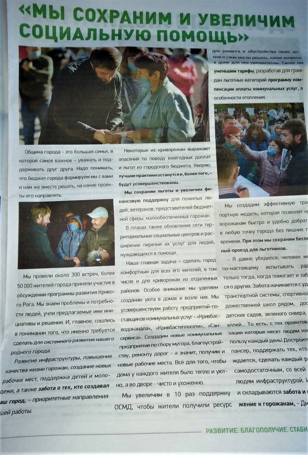 «Я впевнений, що з такими працьовитими та сильними людьми, як у нас, з підтримкою президента України, великих промислових підприємств Кривий Ріг стане в один ряд з кращими містами країни», - говориться у агітці.