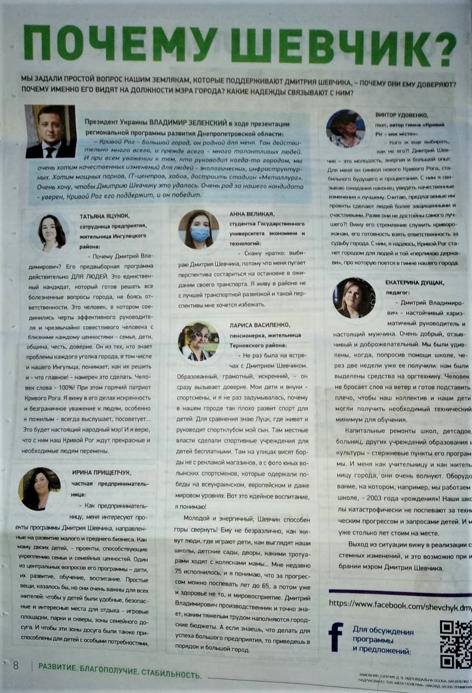 На одній сторінці наведені роздуми людей на тему «Чому Шевчик?». Серед них президент Володимир Зеленський, поет, студентка, пенсіонерка, педагог, приватний підприємець.