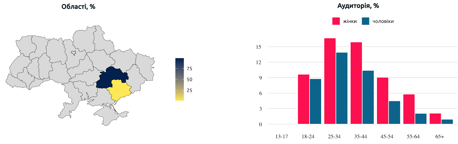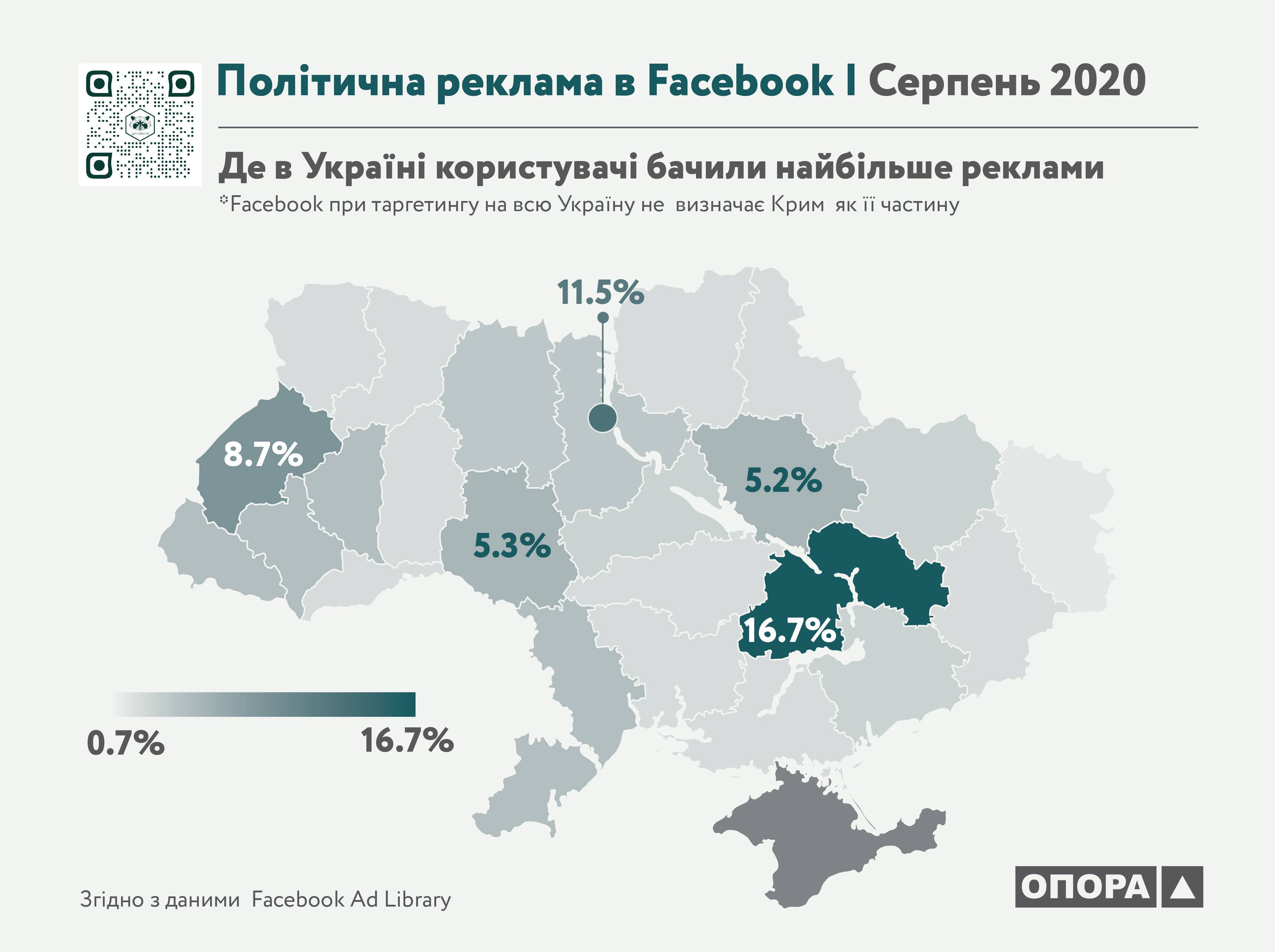 Якщо на початку року найбільше політичної реклами таргетувалося на користувачів з Києва, то далі ця тенденція змінилася. Кияни (11,5%) залишилися серед найбажаніших отримувачів рекламного контенту, але поступилися першістю жителям Дніпропетровщини (16,7%). Окрім того, рекламодавці при визначенні географічних налаштувань показів політичної реклами віддавали перевагу мешканцям Львівської (8,7%), Вінницької (5,3%), Полтавської (5,2%), Тернопільської (5%) областей. Вже традиційно найменше реклами в розрізі регіонів України було таргетовано на перегляди користувачами з Луганської області (0,7%).