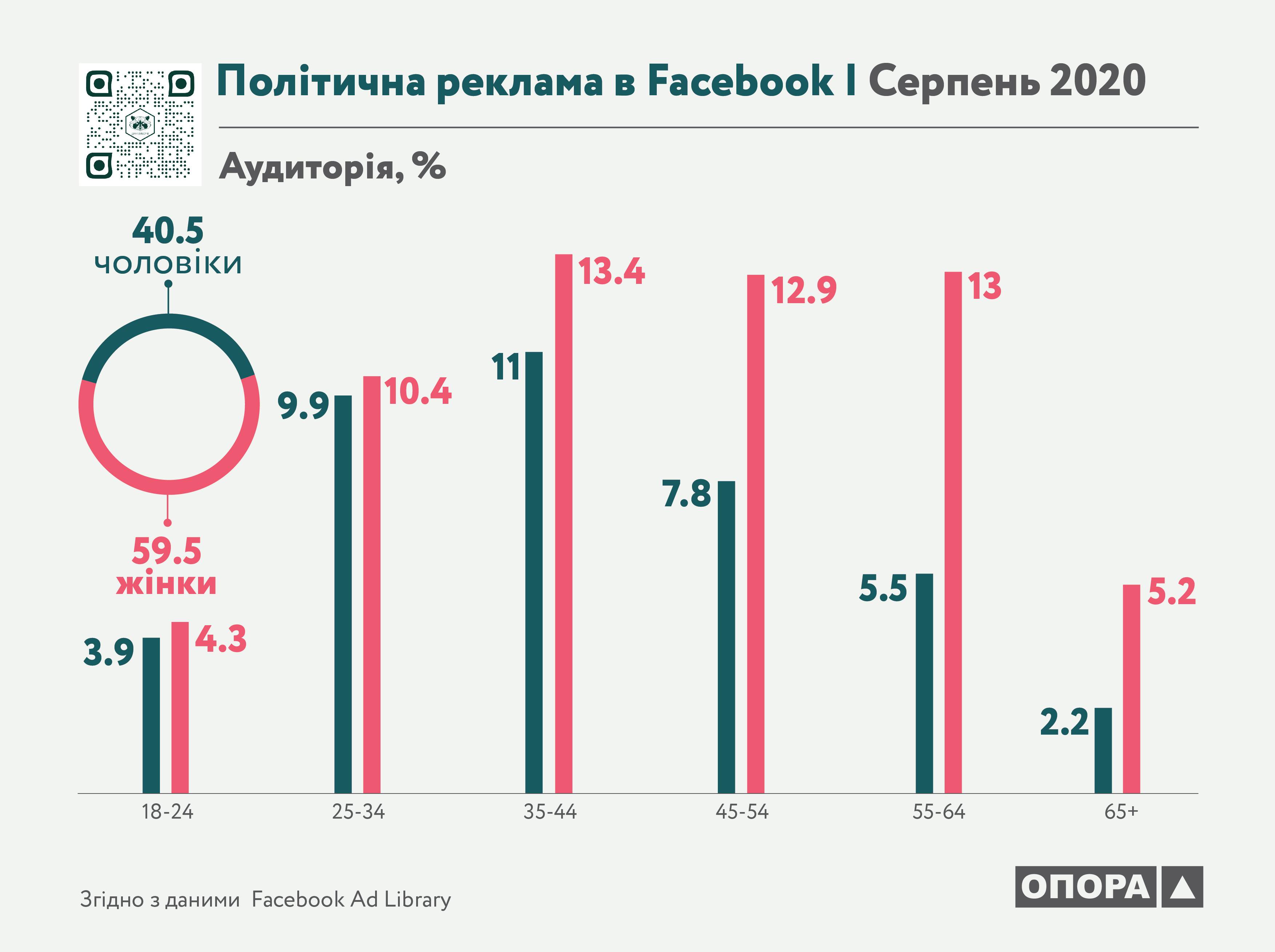 Налаштовуючи свою політичну рекламу, здебільшого її замовники обирали жіночу аудиторію (60%). Відповідно чоловіча аудиторія політичного промо-контенту склала лише 40%. Однак у серпні змінився вибір у налаштуваннях за віковими групами. Як серед жінок, так і серед чоловіків у фокусі замовників політичної реклами були користувачі 35 – 44 років.