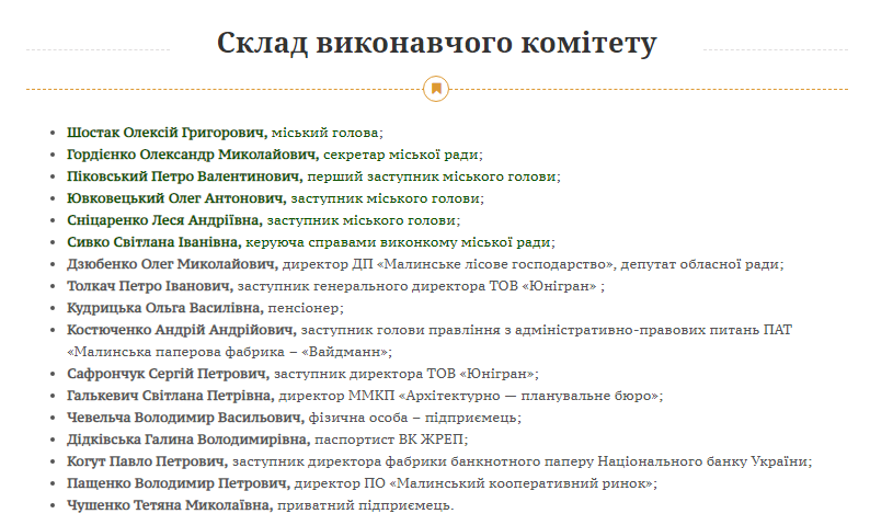 У виконавчому комітеті міської ради 17 членів серед яких крім представників влади директори місцевих підприємств та фізичні особи підприємці.