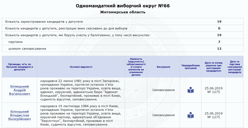 Як і на попередніх Парламентських виборах в окрузі найбільше зареєстрованих кандидатів у народні депутати – 19. З них 12 – самовисуванці та 7 від партій.