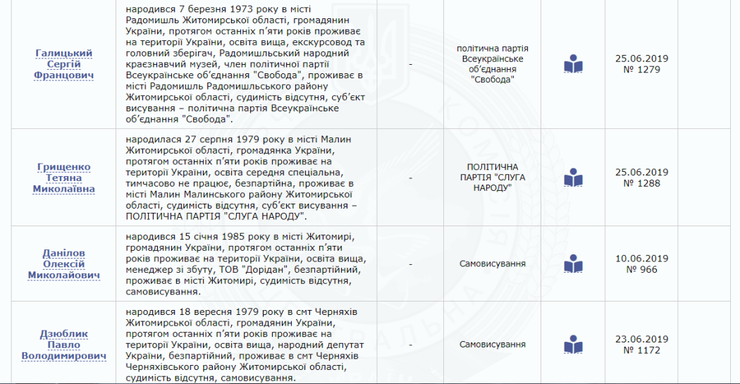 Від ВО «Свобода» в Раду балотується член партії, екскурсовод та головний зберігач в Радомишльському народному краєзнавчому музеї Сергій Галицький. Кандидатом від партії «Слуга народу» є Тетяна Грищенко, на сайті ЦВК вказано, що тимчасово не працює. На виборах Президента України 2019 року очолювала окружну виборчу комісію №66, за поданням Володимира Зеленського. Від ВО «Батьківщина» балотується підприємець, директор, ПП «Землі Полісся», член партії Леонід Корейба. Заступник Коростишівського міського голови Михайло Лукомський балотується від Радикальної партії Олега Ляшка, членом якої він є. Підприємець Анатолій Сачук змагається за депутатський мандат від партії «Опозиційний блок». Партія «Голос» по округу висунула кандидатом адвоката адвокатського об’єднання «Бонюк і Партнери» Антона Соболівського. Від партії «Громадянська позиція» балотується підприємець та партієць Володимир Шатилович.