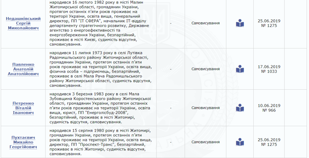 Балотуються як самовисуванці менеджер зі збуту ТОВ «Дорідан» Олексій Данілов. Киянин, генеральний директор, ПП «ІТ СФЕРА2, начальник ІТ-відділу департаменту стратегічного розвитку Державного агентства з енергоефективності та енергозбереження України Сергій Недашківський. Фізична особа підприємець Анатолій Павленко, юрист ПП «Енерголісбуд-2008» Віталій Петренко. Директор, ПП «Проспект-Транс» Михайло Пухтаєвич. Водій Київського міського відділу фізичної культури і спорту інвалідів «Інваспорт», член партії «Разом Сила» Валеннтин Сербін, безпартійний, тимчасово безробітний Богдан Ходаковський та голова правління АТ «Оператор газороподільної системи «ЖИТОМИРГАЗ» Валентин Ющенко.