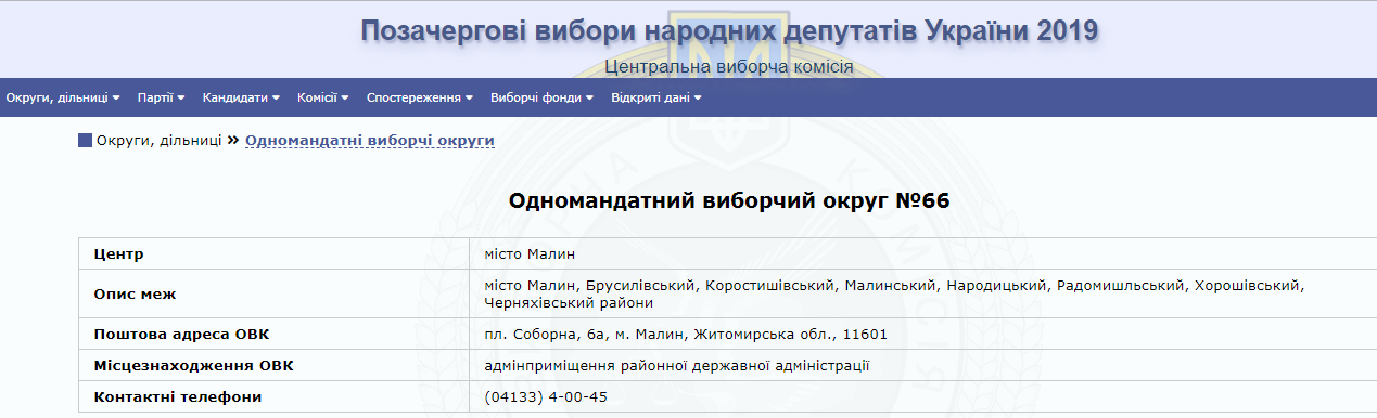 Серед 6 одномандатних виборчих округів Житомирської області найбільшим є № 66 з центром у місті Малин. До його складу входять 7 районів і зареєстровано найбільше кандидатів в народні депутати України – 19. Виборчий процес в окрузі завжди насичений та цікавий.