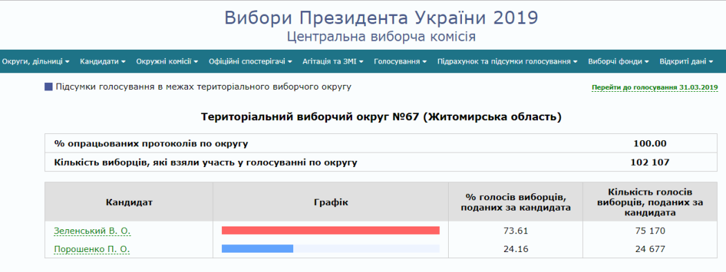 На позачергових виборах до Верховної Ради у 2014 році виборці округу обради нардепом Павла Дзюблика, кандидата від політичної партії «Народний Фронт». За нього проголосували 17 714 виборців (19.12%). На 2 місці з результатом 13.95 % (12 924 голоси) Віталій Журавський, який був нардепом від округу з 2012 по 2014 роки. Балотувався вже як самовисуванець, до цього був членом «Партії регіонів». На 3 місці Іван Литвин, син нардепа від ВО №65 (м. Новоград-Волинський) Володимира Литвина. Іван Литвин набрав 11.90 % голосів за нього проголосували 11 030 виборців. Загалом, за депутатський мандат змагалися 30 кандидатів: 23 самовисуванці та 7 від партій. Павло Дзюблик та Віталій Журавський цьогоріч знову балотуються до Верховної Ради, як самовисуванці.